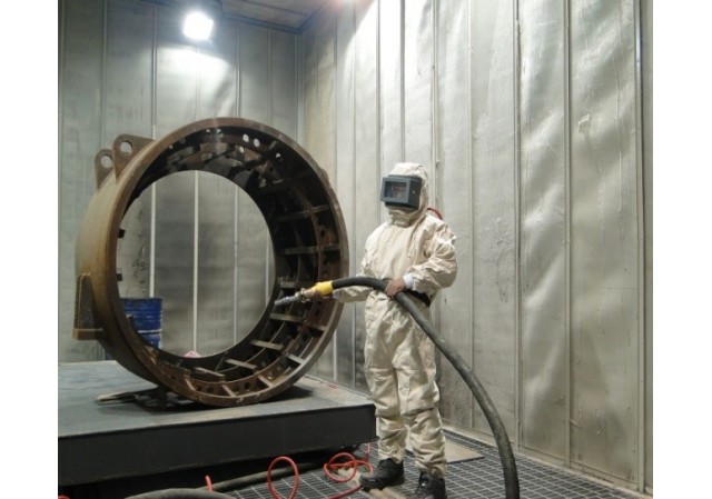 噴砂采用壓縮空氣為動力,以形成高速噴射束將丸料(金金剛砂、鐵砂、鋼丸)高速噴射到需要處理的工件表面,使工件表面的外表面的外表或形狀發(fā)生變化,由于丸料對工件表面的沖擊和切削作用,使工件的表面獲得一定的清潔度和不同的粗糙度,使工件表面的機械性能得到改善,因此提高了工件的抗疲勞性,增加了它和涂層之間的附著力,延長了涂膜的耐久性,也有利于涂料的流平和裝飾。